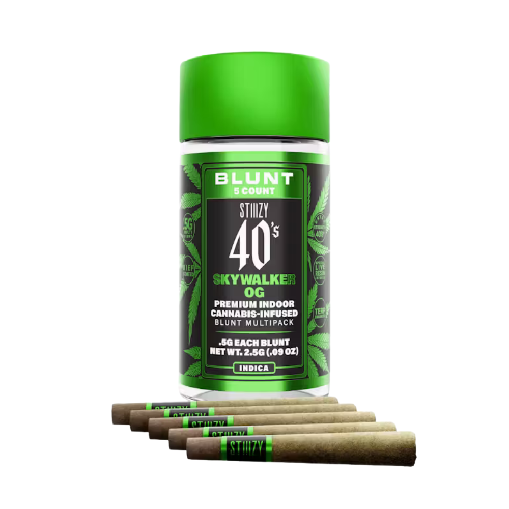 STIIIZY 40's blunts are rolled with 100% tobacco free, kief dusted hemp wraps, secured tightly around a glass tip. We’ve packed each infused blunt with high quality indoor flower so that every inhale is just as good as every exhale. STIIIZY 40's Blunts are reinventing the way you get high by being the first to introduce 40% cannabinoids (THC) potency with live resin infusion. Pass the blunt. Each blunt is .5g, total weight is 2.5g.